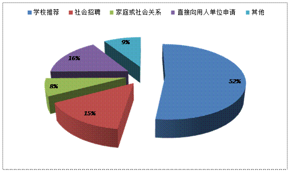 通過問卷調查統計2016屆畢業生就業過程運用的主要途徑分類:學校推薦52.3%;社會招聘15%;家庭或社會關系7.5%;直接向用人單位申請16.2%;其他9%。