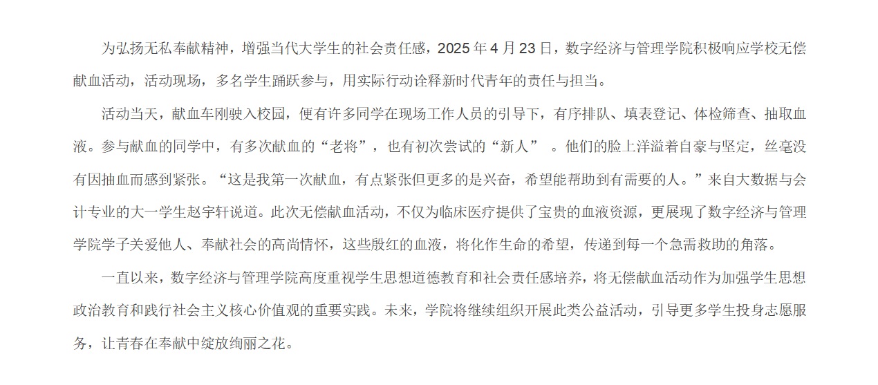 熱血傳遞生命 青春彰顯擔當——數字經濟與管理學院開展大學生無償獻血活動