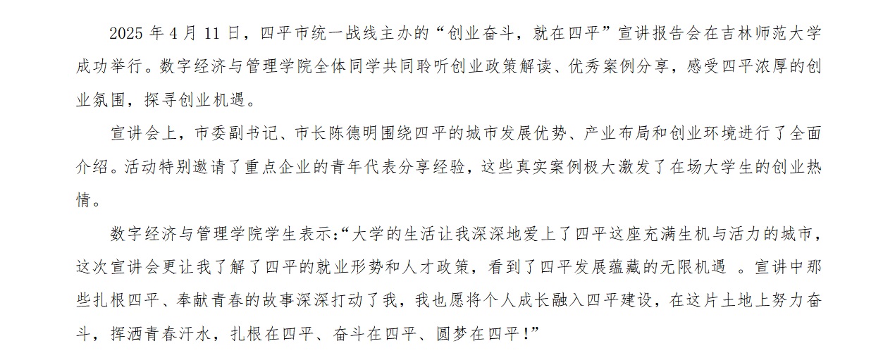 青春逐夢正當時!“創(chuàng)業(yè)奮斗,就在四平”宣講會點燃大學生留平就業(yè)創(chuàng)業(yè)熱情