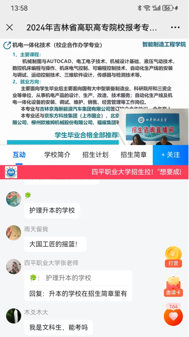 為滿足廣大考生和家長高考咨詢需求,搭建考生、家長與院校溝通橋梁,了解新高考各項(xiàng)招生政策,熟悉招生院校辦學(xué)特色、專業(yè)優(yōu)勢,7月29日,在學(xué)校招生辦統(tǒng)一安排下,智能制造工程學(xué)院利用“中國好大學(xué)”和“吉林省2024專科線上網(wǎng)絡(luò)咨詢會(huì)”平臺(tái),有效的進(jìn)行了兩場線上專場網(wǎng)絡(luò)咨詢會(huì)直播宣傳。