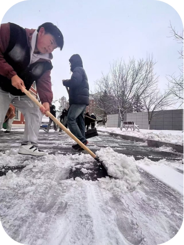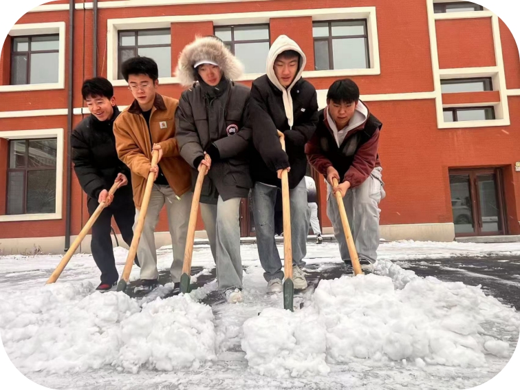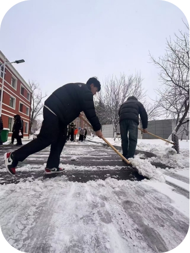 小雪時節,寒冬將至。11月26日,2024年的第一場大雪如約而至,大雪紛紛揚揚,氣溫驟降,給四平職業大學校園蓋上一層厚厚的白毯,校園銀裝素裹的同時也為師生的出行帶來了不便和安全隱患。在學院領導和老師的安排下,我院24級全體學生在學生干部的帶領下,冒著嚴寒,踩著厚厚的積雪,拿著清雪工具,第一時間清理分擔區道路上的積雪。