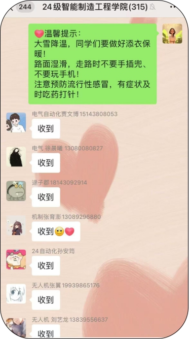 冬季校園,來自天南地北的學生也得到了輔導員老師親切關懷,為銀裝素裹的冬日帶來了不一樣的溫暖。