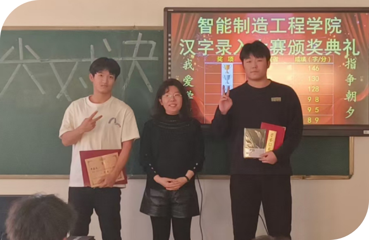 參賽選手隨即展開激烈的比賽,整個(gè)機(jī)房內(nèi)只聽見一片清脆有力的敲擊鍵盤的聲音,選手們的指尖在鍵盤上快速擊打,運(yùn)指如飛,嫻熟的指法和有節(jié)奏的敲擊,展示了一場(chǎng)緊張刺激的指尖上的精彩。本次漢字錄入比賽采用的是“金山打字通”軟件,是一款功能齊全、數(shù)據(jù)豐富、界面友好的、集打字練習(xí)和測(cè)試于一體的打字軟件,能夠針對(duì)不同層次的學(xué)生定制個(gè)性化的練習(xí)課程,輸入法簡單易學(xué),并且輔以打字游戲。經(jīng)過緊張刺激的五分鐘對(duì)決,來自24級(jí)電氣自動(dòng)化專業(yè)班的姚俊成、李嘉成、無人機(jī)應(yīng)用技術(shù)專業(yè)班的黃愷揚(yáng)、工業(yè)機(jī)器人技術(shù)專業(yè)班茹放、電氣自動(dòng)化專業(yè)班賈辰宇、機(jī)械設(shè)計(jì)與制造專業(yè)班高士然等六名同學(xué)以優(yōu)異的成績分獲一、二、三等獎(jiǎng)。在賽場(chǎng)傳承環(huán)節(jié)中,上屆漢字錄入冠軍23級(jí)機(jī)電一體化專業(yè)班韓貴斌同學(xué)為本屆冠軍姚俊成同學(xué)佩戴冠軍桂冠,慶祝姚俊成同學(xué)奪冠,兩位冠軍愉快的合影留念。