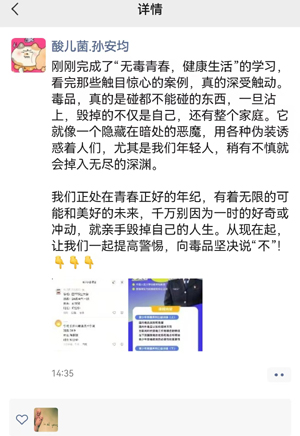 通過高校線上公益課,進一步加深了學生對毒品的直觀認識,同時也增強了學生的禁毒意識和自我保護能力。全體學生紛紛表示,要用自己學到的知識提醒身邊的人警惕“毒品陷阱”,禁毒需要全民參與,筑牢拒毒防毒根基。 下一步,智能制造工程學院將持續開展形式多樣的禁毒宣傳教育活動,不斷擴大禁毒教育的覆蓋面和影響力,筑牢青少年識毒防毒拒毒的思想防線,為青少年的健康成長保駕護航。 | |