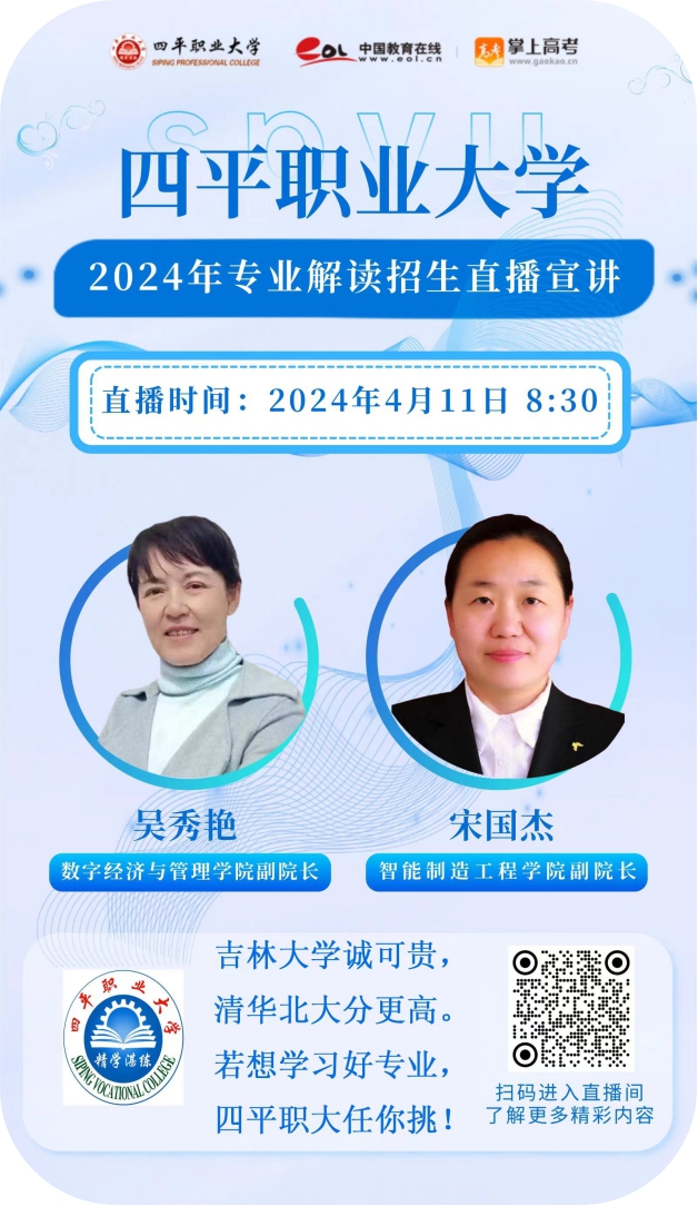 吉林大學誠可貴,清華北大分更高。若想學習好專業,四平職大任你挑! 4月11日,為了擴大學校的影響力,回復考生和家長的關注及疑問,以職教園區建設發展為契機,四平職業大學利用“中國教育在線”、“掌上高考”等咨詢平臺,進行招生直播宣傳活動。